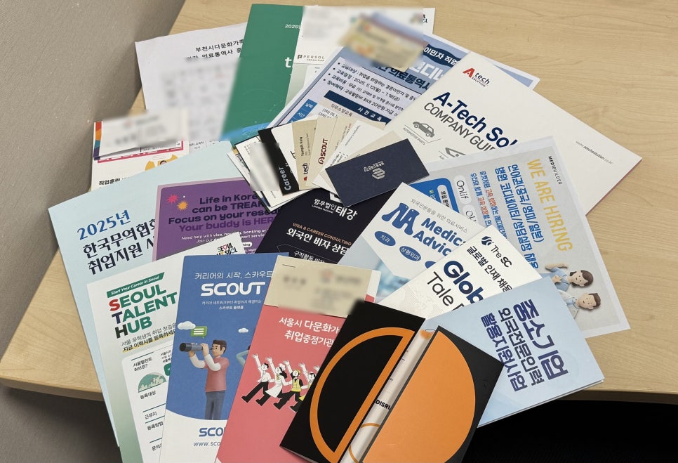 현장에서 다양한 기업들과 교류하며 받아온 리플렛과 명함들이예요!